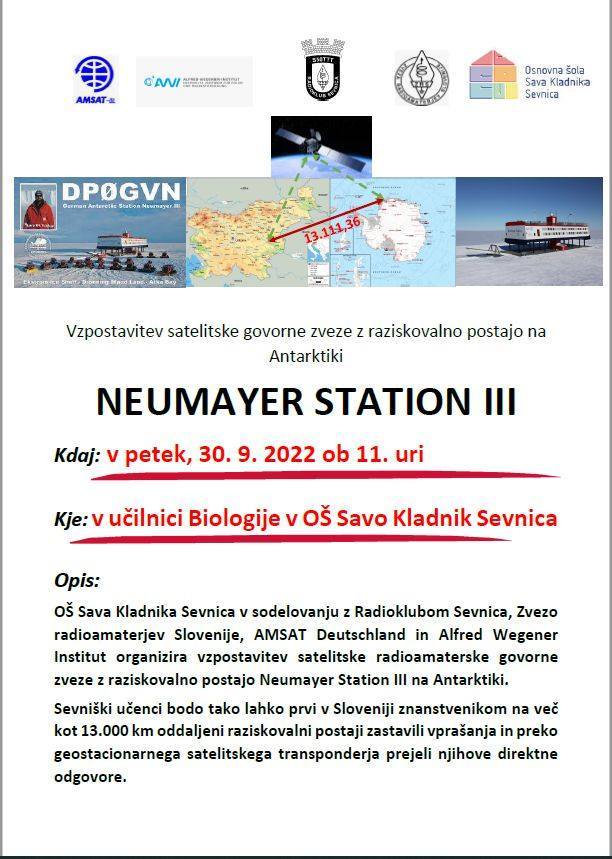 Danes se bo na osnovni šoli Savo Kladnik Sevnica zgodil prav poseben dogodek. Učenci bodo s pomočjo radioamaterjev iz Radiokluba Sevnica - S50TTT vzpostavili zvezo preko satelita QO-100 z raziskovalno postajo Neumayer station III. Otroci bodo znanstvenikom/raziskovalcem zastavili nekaj vprašanj.