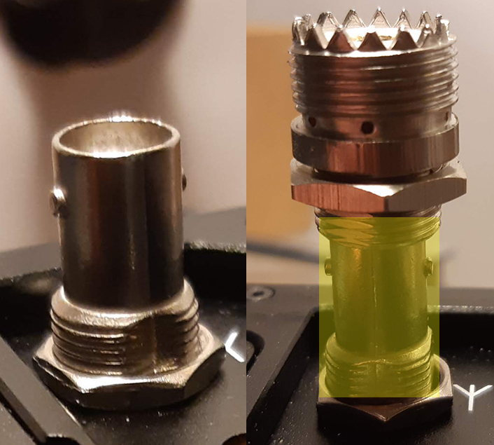 Ugotovil sem (glej sliko), da sta navoja (za panel) pri konektorju na postaji in konektorju SO239 za panel identična (rumen okvirček, malo je slikano pod kotom in ni tako očitno).