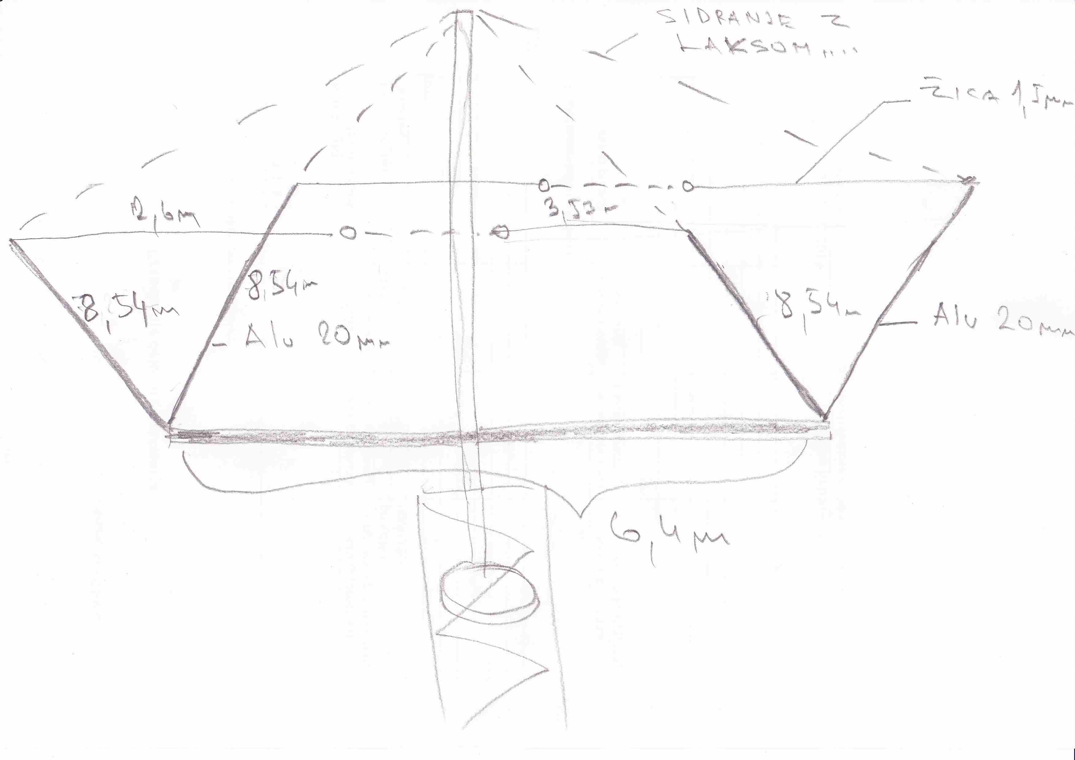 Dopoldan sem imel malo več časa pa sem na hitro malo modeliral. Ideja za "V" Moxon je mogoče zanimiva, predvsem vidim prednost v boljši mehanski odpornosti na sneg in žled glede na Adijev Moxon. Informativne dimenzije so podane na skici ostalo pa se vidi iz MMana gal-programa. Predvidel sem spodnjo točko kjer se antenski boom vpne na cca 12- 13m višine, dolžina boom-a pa je cca 6,4m. Osnovni V elemeti so iz 20mm ALU profilov ( seveda boš dal najbrž teleskopske in spodaj močnejše) ,ki se podaljšajo z 1,5mm žico. Sidraš pa nato s plastičnim laksom ali kaj podobnega. Seveda je to samo ideja in bi jo bilo potrebno še dobro razdelati. Če kdo hoče mu pošljem tudi originalne datoteke,ker bi se dalo anteno že optimirati.
