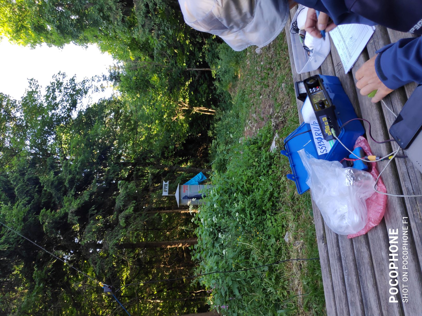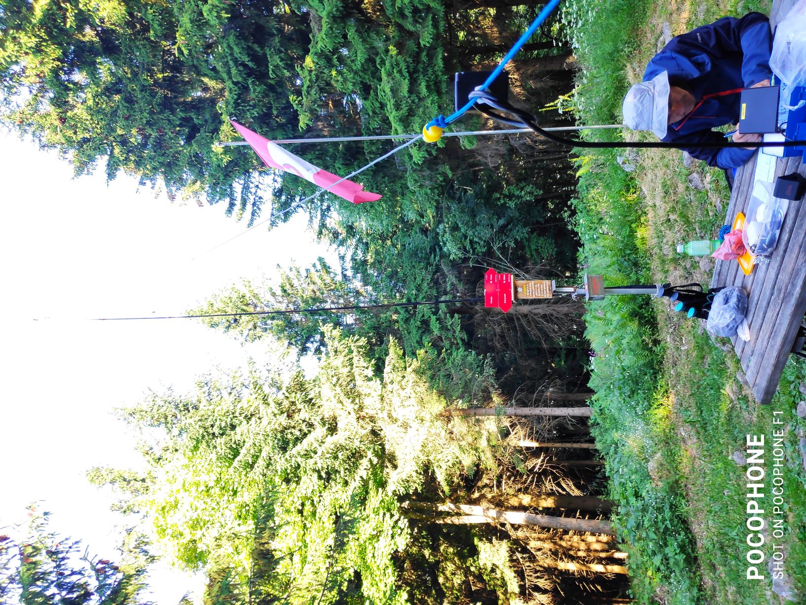Razpeljeva EndFed anteno, tehniko na mizo in kar hitro je vse nared za start. Pravkar prispe na vrh še možakar z ženo. Pohvalil se je, da še zna tudi nekaj telegrafije iz časov vojaščine.