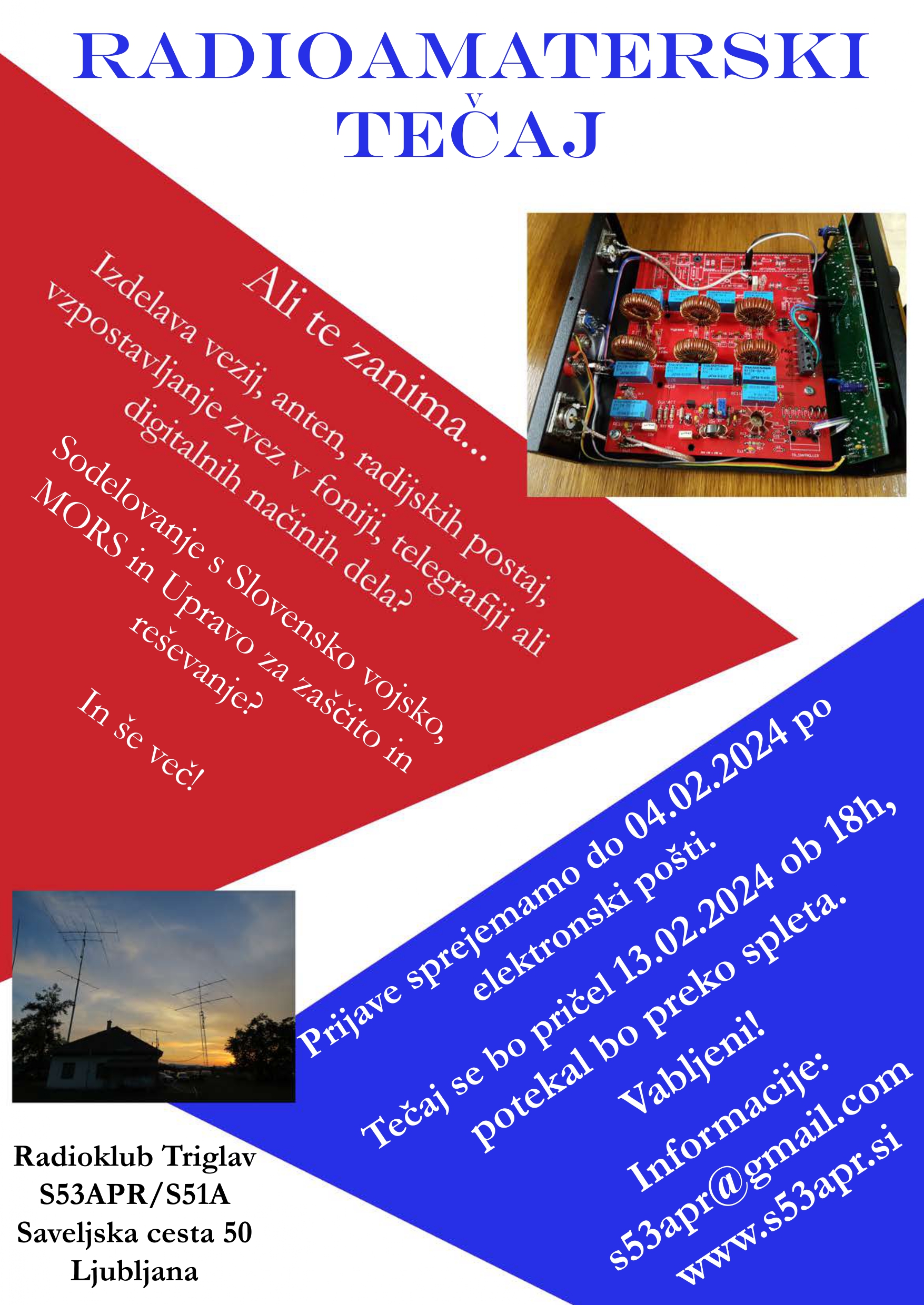 Tudi v letu 2024 bo RK Triglav izvajal tečaj za radioamaterje. Datum pričetka je: 13.2.2024
