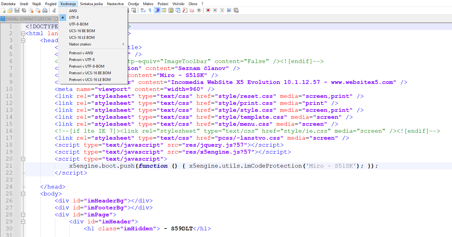 s51sk napisal/-a:Hvala za odgovor. Mogoče delam kaj narobe. Sem pogledal html-je po tvojem navodilu, pa so že kodirani v UTF-8 in se nič ne zgodi pri kliku na "Pretvori v UTF-8" Seveda se tudi ne da shraniti. Gledam pa tako datoteke na lokalu kot na strežniku. Verjetno rabim še malo pomoči